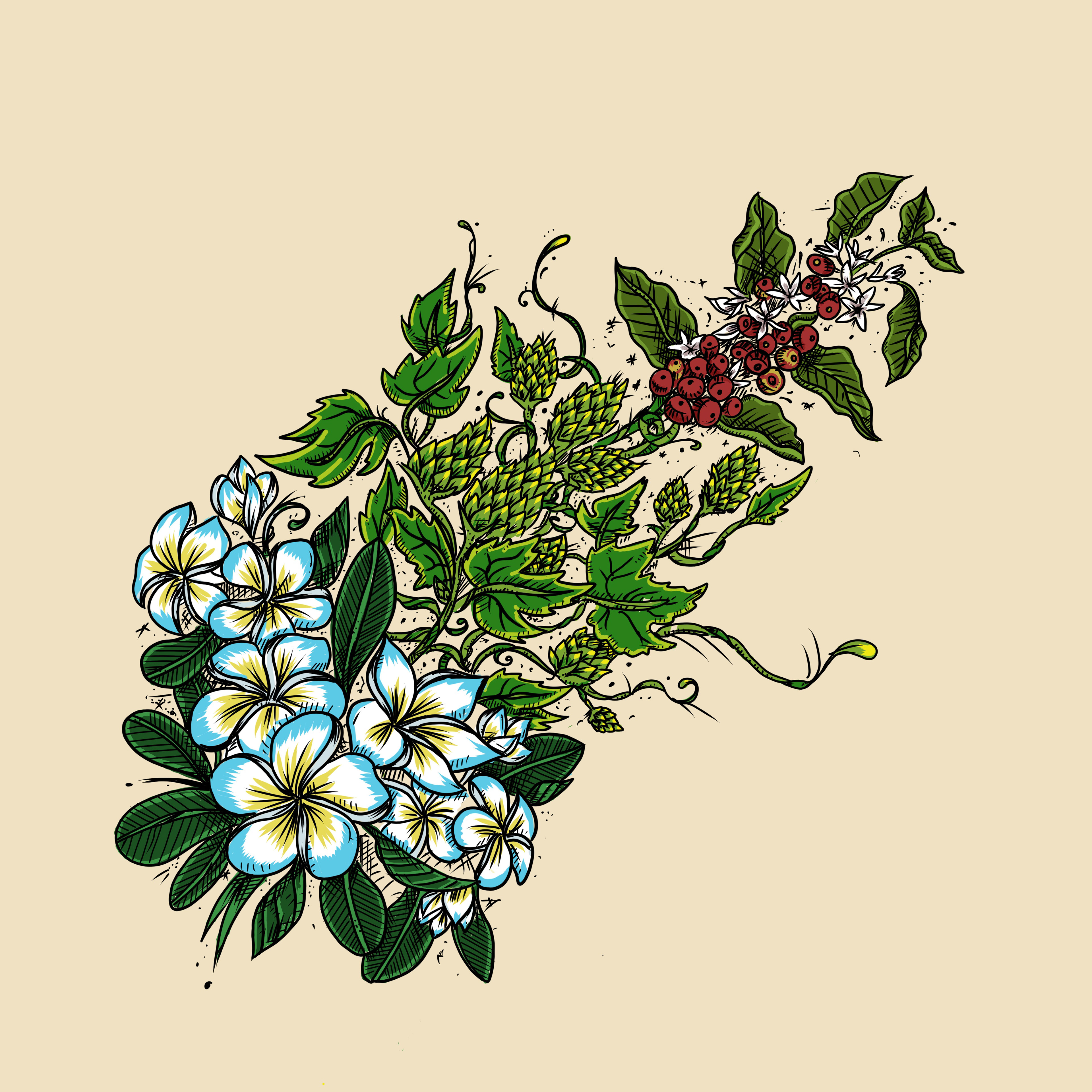 A botanical illustration blending Plumerias, hop vines, and a coffee plant, crafted for a friend.